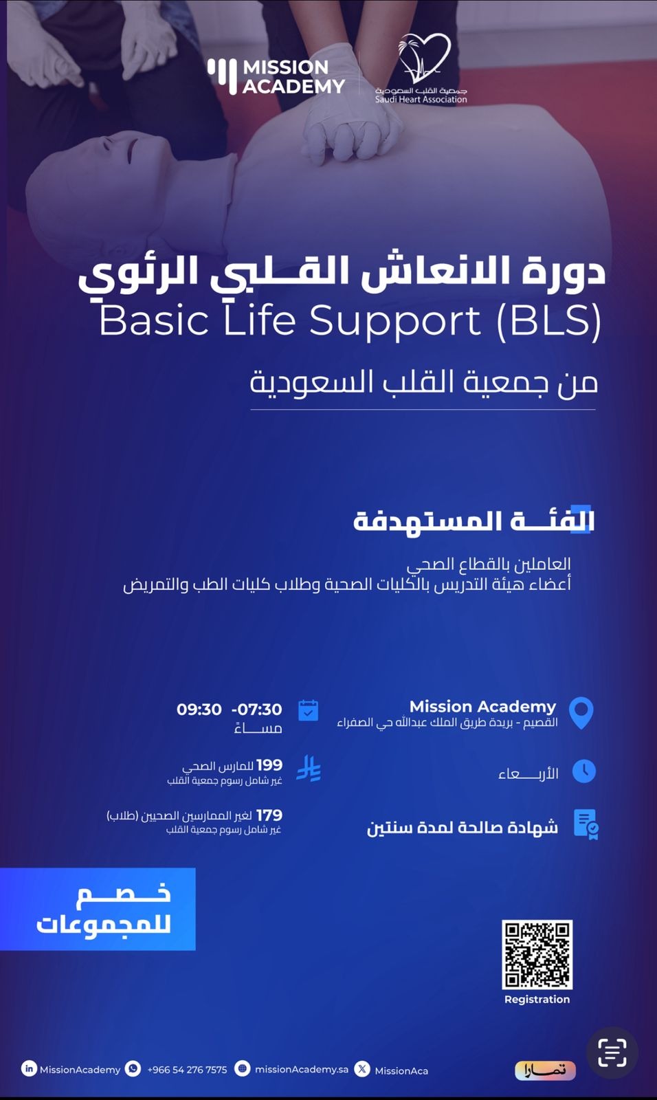 The Basic Life Support (BLS) course is a practical, in-person training program delivered by Mission Academy in collaboration with the Saudi Heart Association.